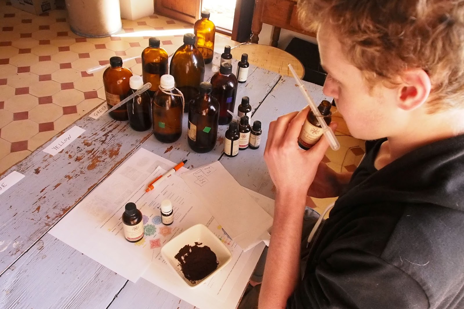 This year we decided to put Callum to the test, and we took out all of our many essential oil bottles, got some coffee grounds on hand and started working our way through the bottles, placing them in order of the colours of our chakras.